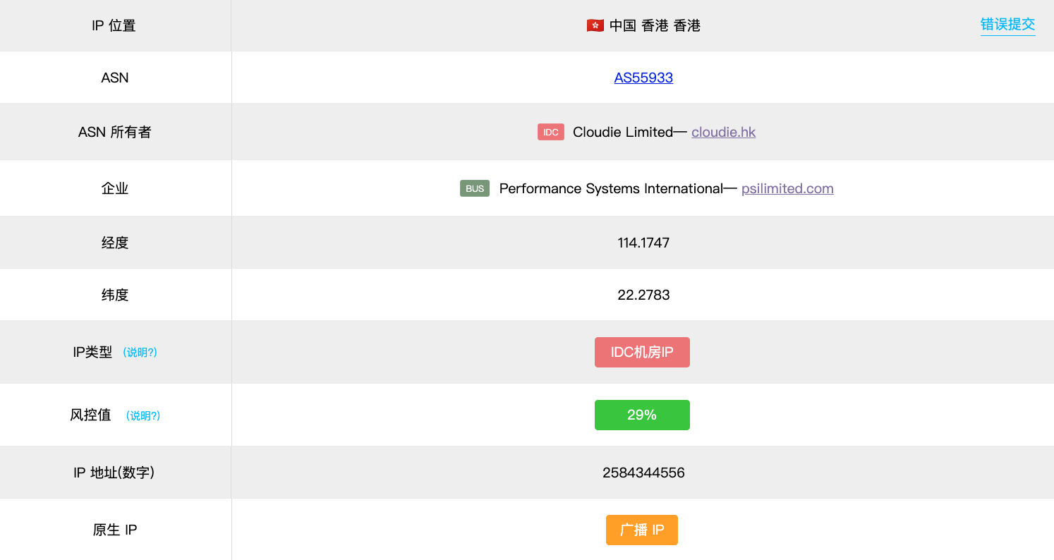 国家: HK 城市: Hong Kong 服务商: AS55933 Cloudie Limited