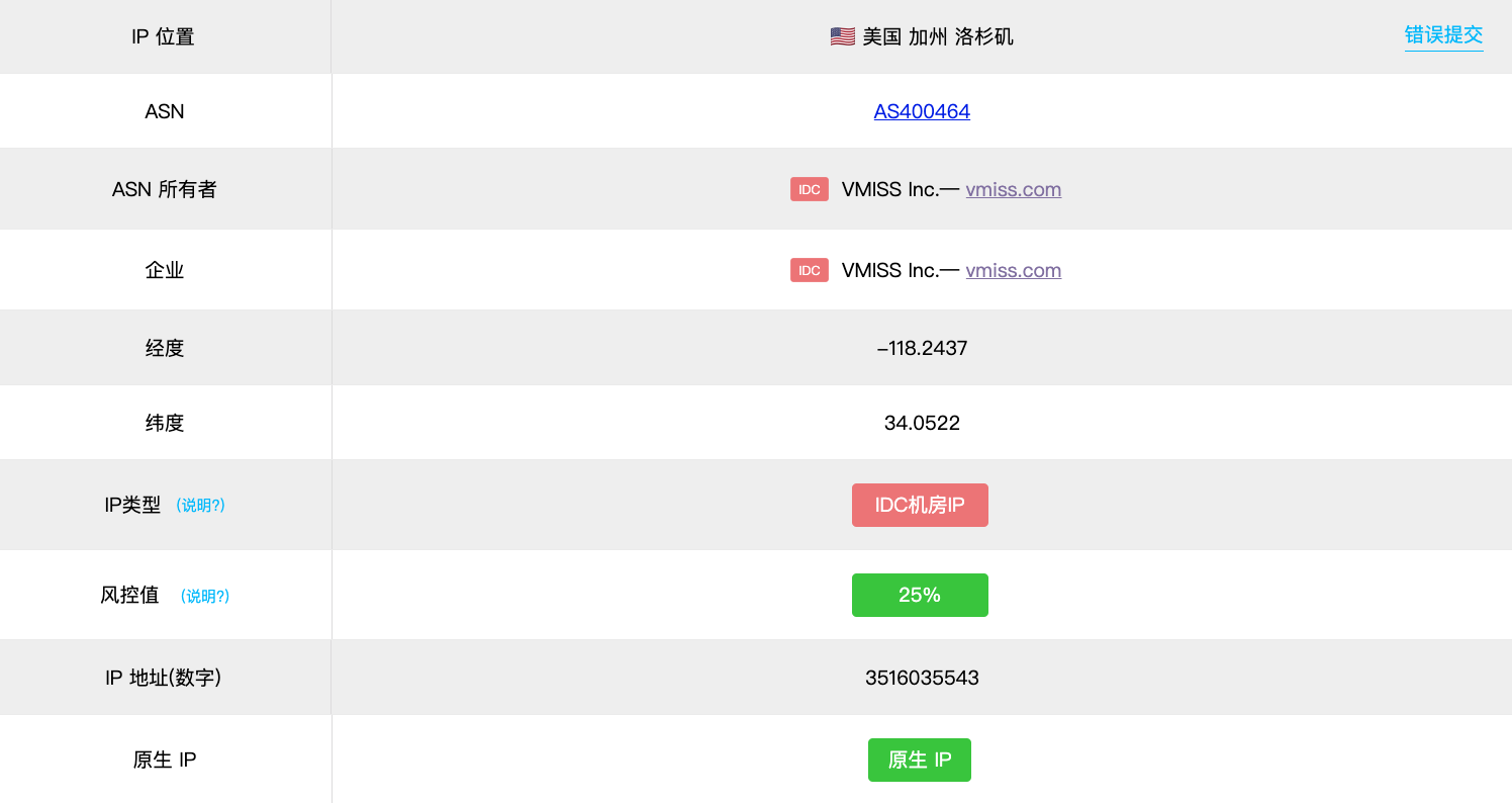 国家: US 城市: Los Angeles 服务商: AS400464 VMISS Inc.